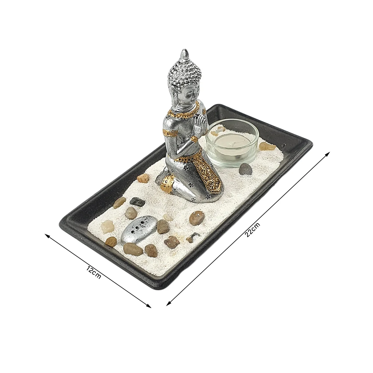1 statue Bouddha argentée, 1 photophore et 1 porte-encens avec du sable blanc et des pierres décoratives sur 1 plateau rectangulaire en bois noir de taille L 22 x l 12 cm.