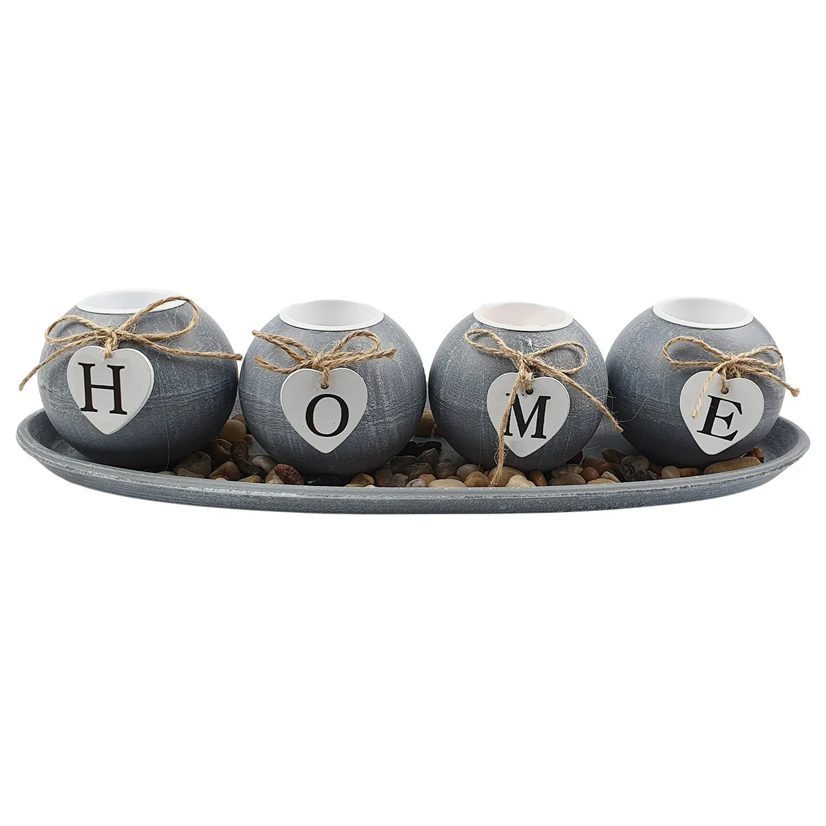 4 Photophores ronds en bois cérusé gris avec 1 lettre sur chacun d’eux formant le mot “HOME”, avec des pierres décoratives sur 1 plateau oval en bois cérusé gris de taille L 39.0 x l 8.5 x 14.0 cm, pouvant servir de décoration de table ou simplement mettre une ambiance romantique par exemple.