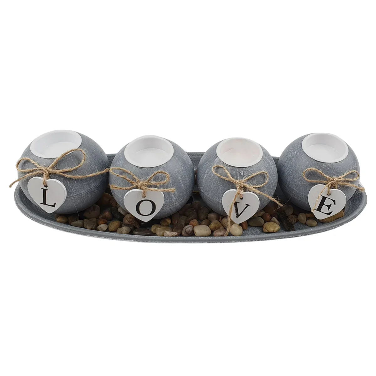 4 Photophores ronds en bois cérusé gris avec 1 lettre sur chacun d’eux formant le mot “LOVE”, avec des pierres décoratives sur 1 plateau oval en bois cérusé gris de taille L 39.0 x l 8.5 x 14.0 cm, pouvant servir de décoration de table ou simplement mettre une ambiance romantique par exemple.