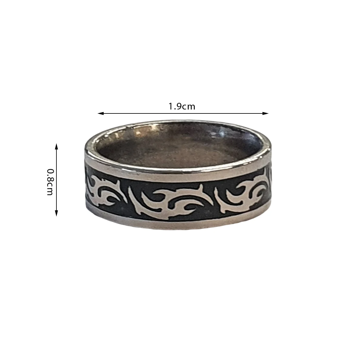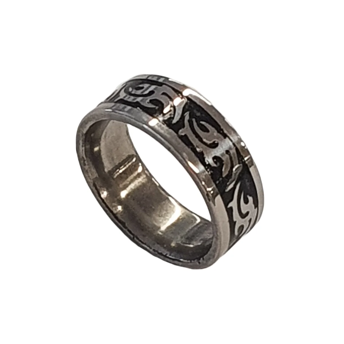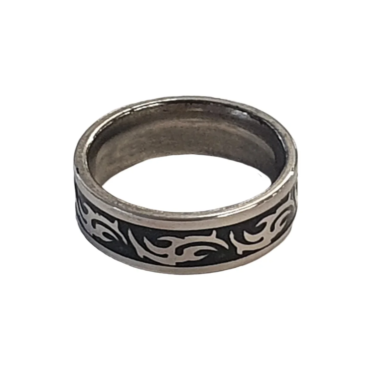 Une bague à motifs Tribal en acier inoxydable argenté et noir de H 0.8 cm pour un port quotidien sans noircissements dans le temps.