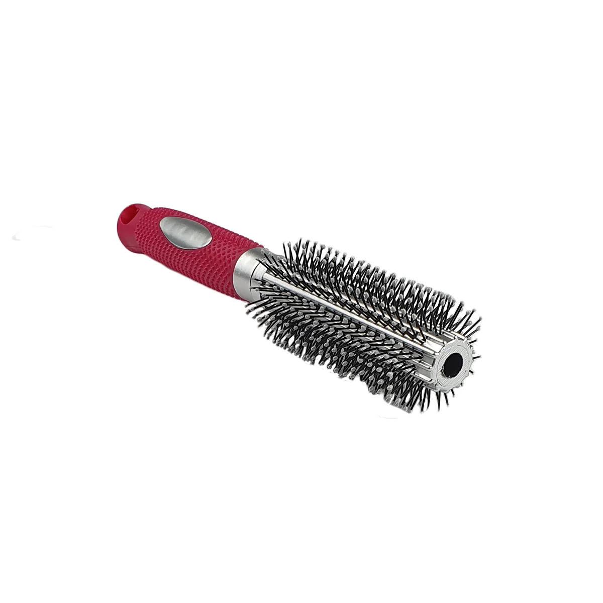 Une brosse à cheveux ronde en plastique de couleurs argent avec un manche en caoutchouc fuchsia et des picots courts en finition boule.