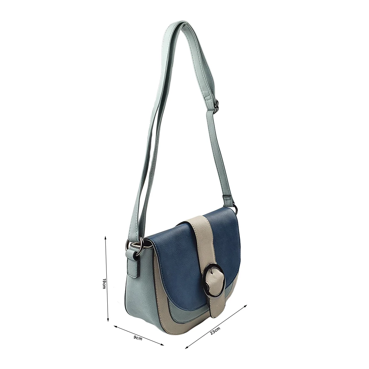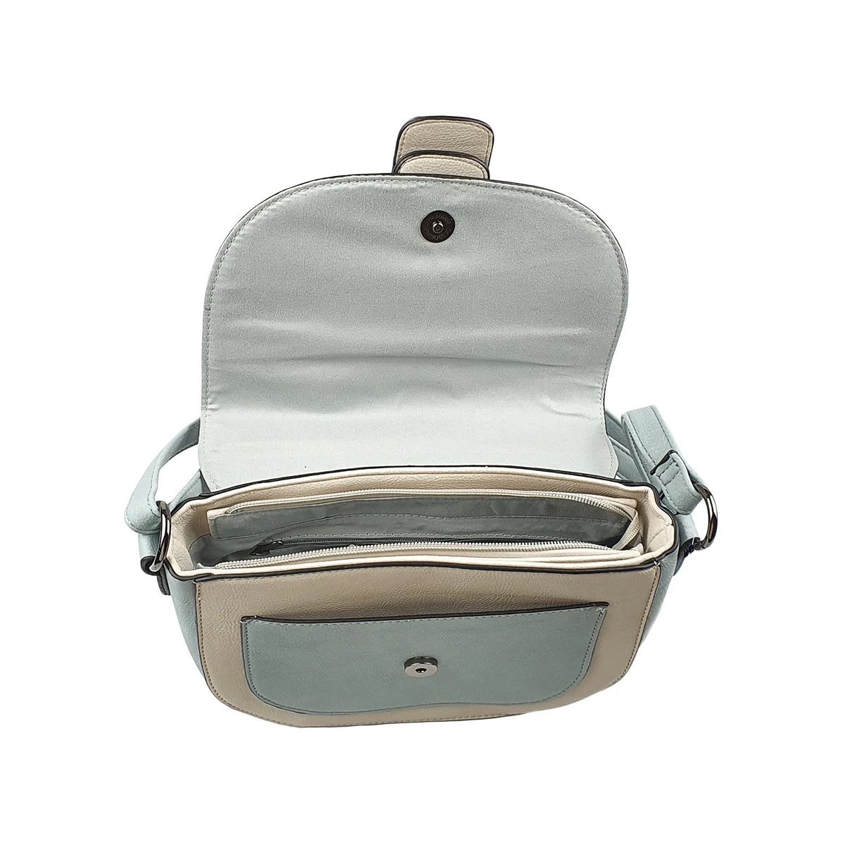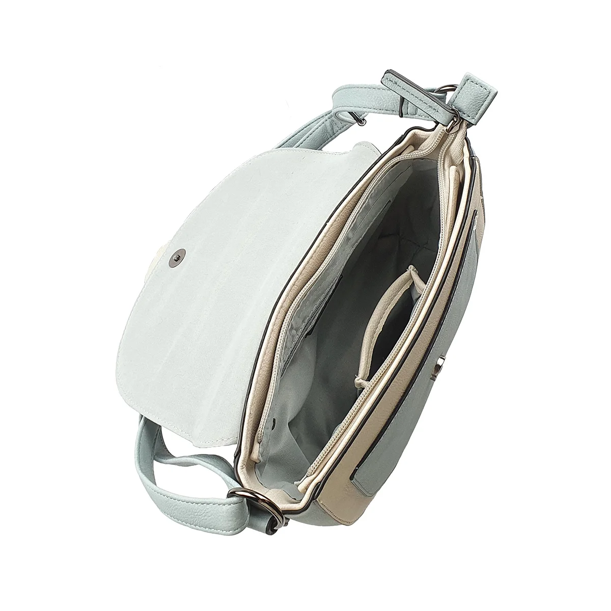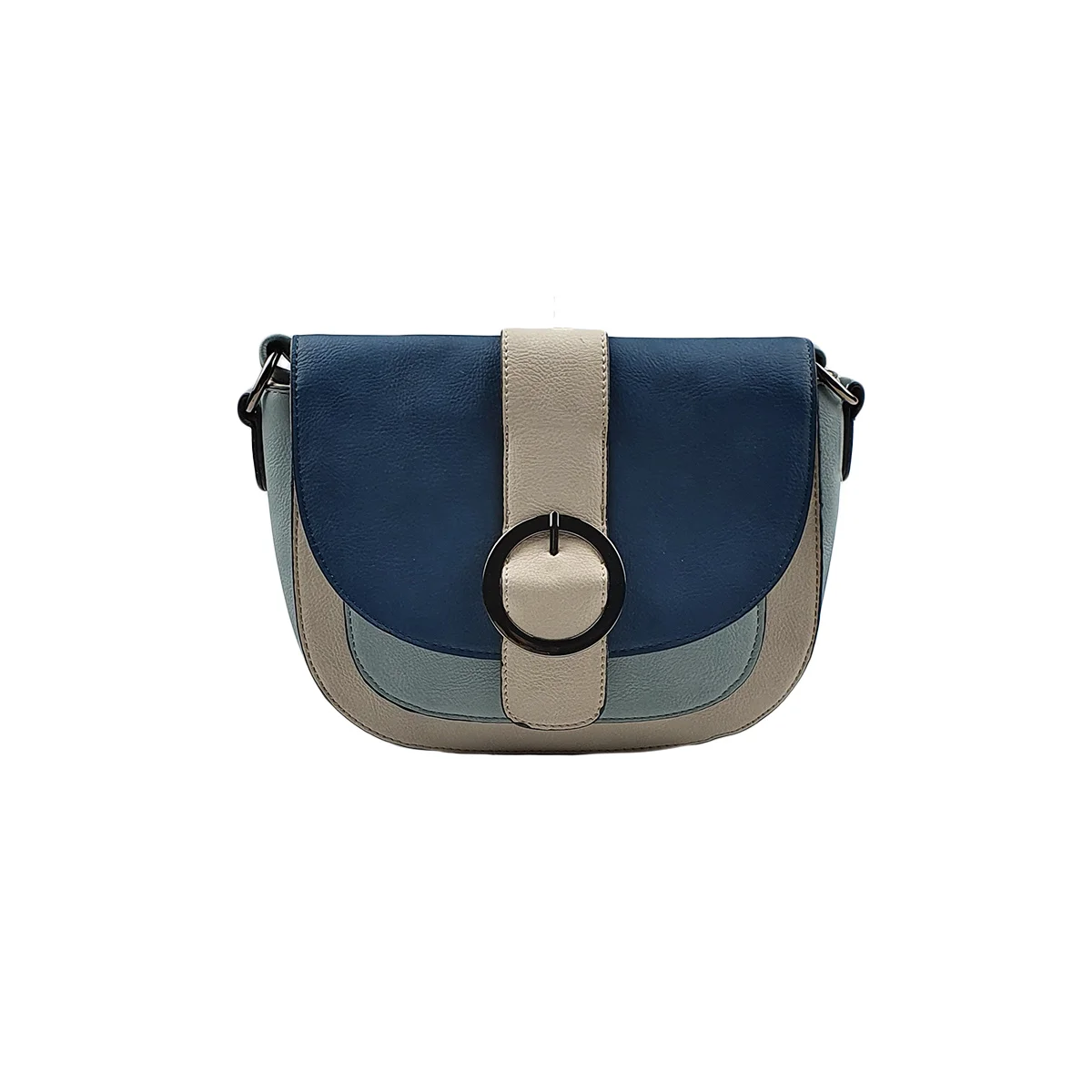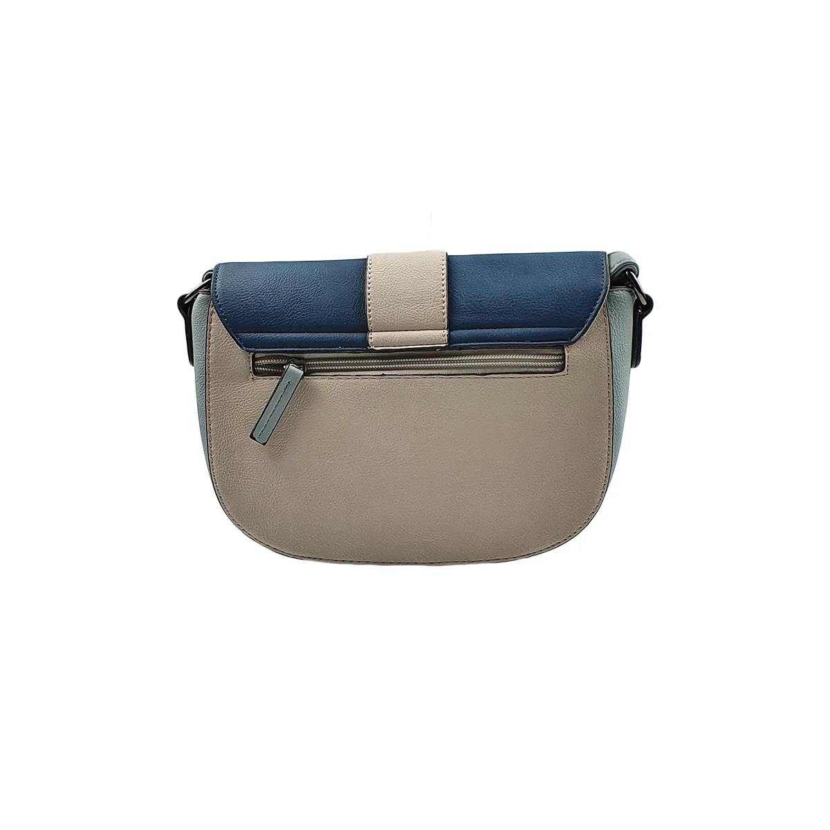 Un sac à main synthétique à plusieurs compartiments et pochettes de taille L 23 x l 9 x H 19 cm à bandoulière réglable.