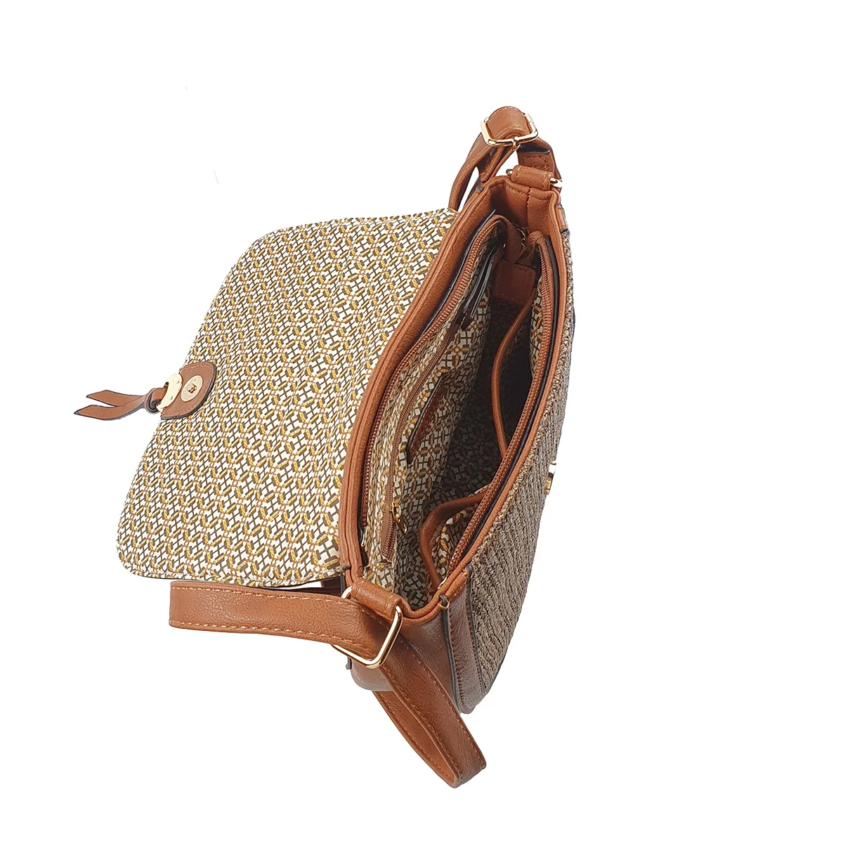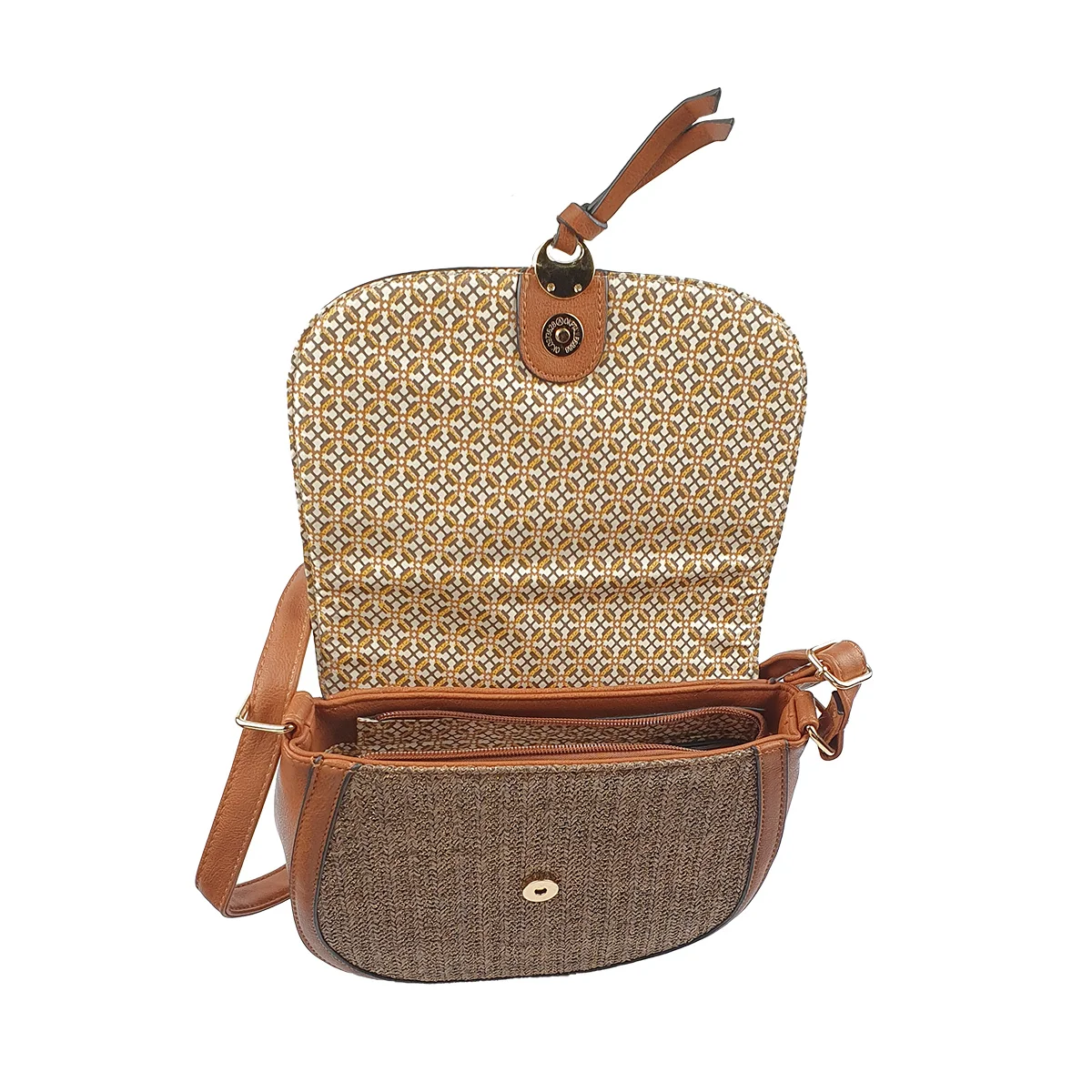 Un sac à main synthétique à plusieurs compartiments et pochettes de taille L 24 x l 8 x H 20 cm à bandoulière réglable.